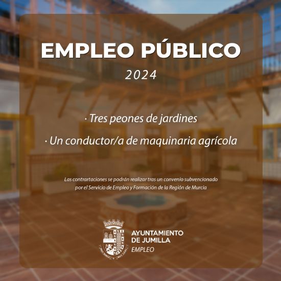 El Ayuntamiento de Jumilla recibirá subvenciones a través del Servicio de Empleo y Formación de la Región de Murcia para la contratación de 4 trabajadores que desempeñen trabajos de peones de jardines y conductor de maquinaria agrícola respectivamente. Estos puestos de trabajo se cubrirán a principios del año 2024 con oferta de empleo al SEF.