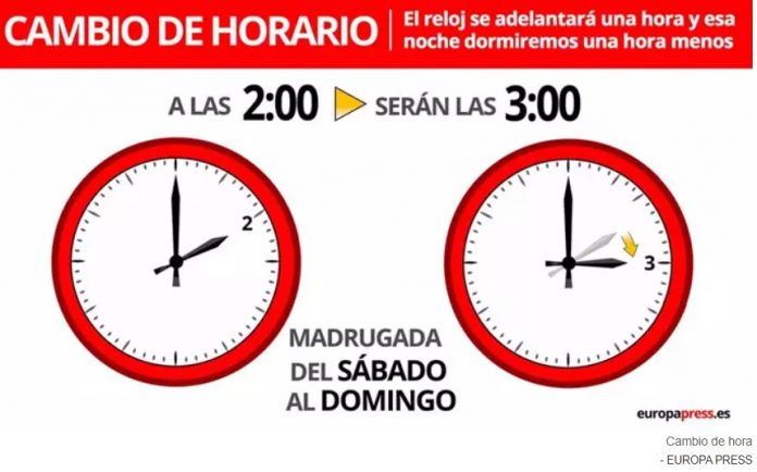 Esta noche los relojes se adelantan una hora. El cambio de hora de primavera se producirá en la madrugada de este lunes 31 de marzo, de forma que a las 2:00 horas serán las 3:00 horas. Con este ajuste, damos la bienvenida al horario de verano y nos despedimos de días más cortos y noches más largas.