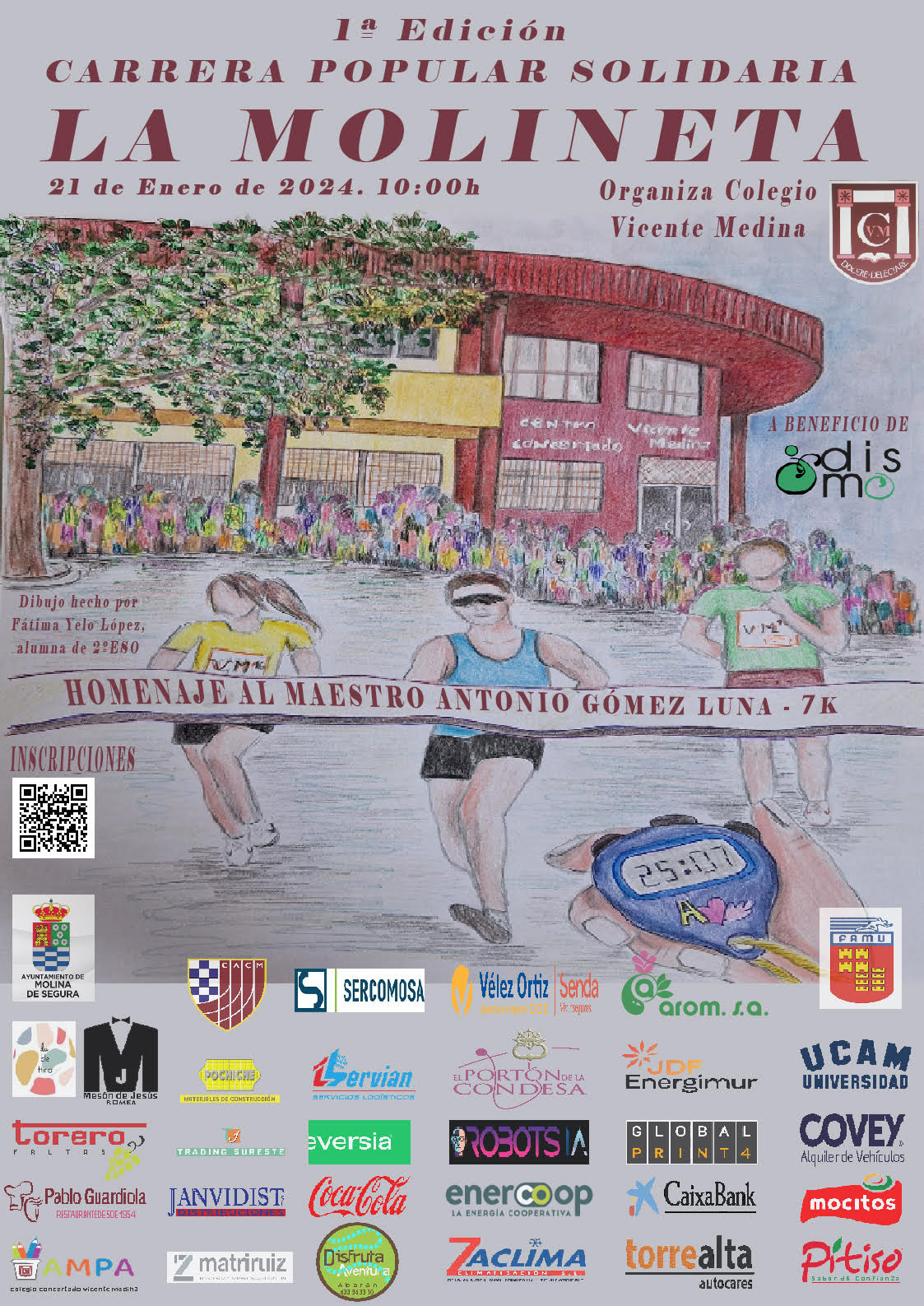 El Colegio Concertado Vicente Medina de Molina de Segura, junto con la Concejalía de Deporte y Salud del Ayuntamiento de Molina de Segura y la FAMU, ha organizado la I Carrera Popular Solidaria La Molineta Colegio Concertado Vicente Medina, que tendrá lugar mañana, domingo 21 de enero. El evento, que se llevará a cabo en homenaje al maestro Antonio López Luna, se correrá a beneficio de DISMO y es parte del calendario del circuito de carreras populares Región de Murcia Running Challenge 2024.