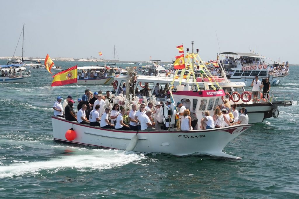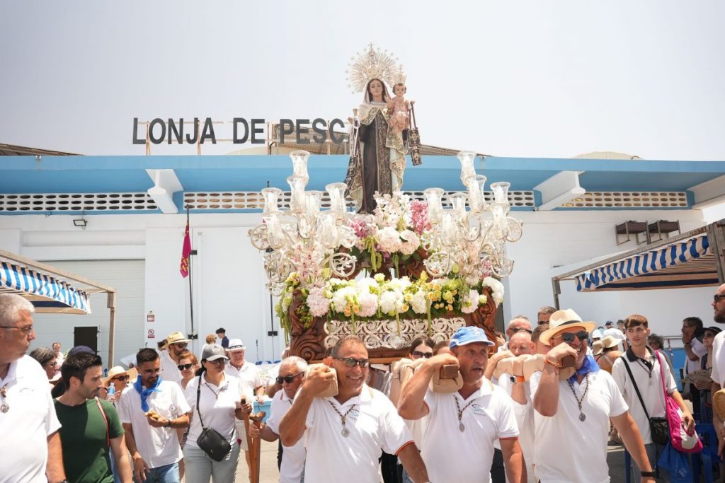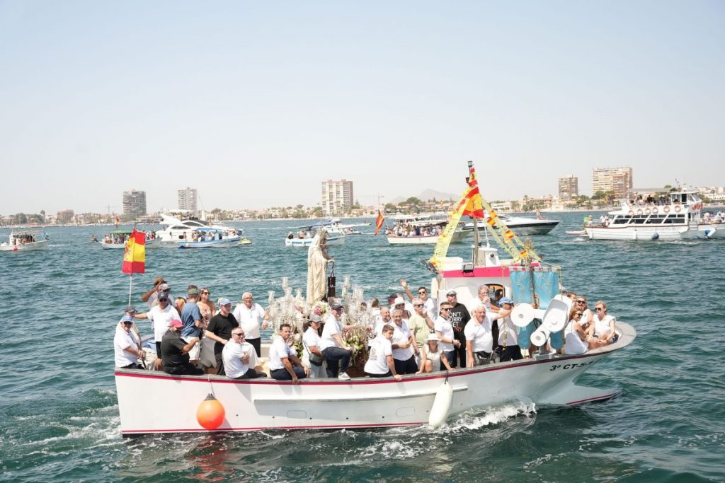 Una vez en el puerto, la imagen de la Virgen del Carmen embarcó en el barco Nuevo San Francisco para realizar un recorrido por el Mar Menor, escoltada por numerosas embarcaciones pesqueras y de recreo. Tras una oración y la ofrenda de claveles al mar, la patrona regresó a tierra firme para una misa en la Lonja de Pescado.