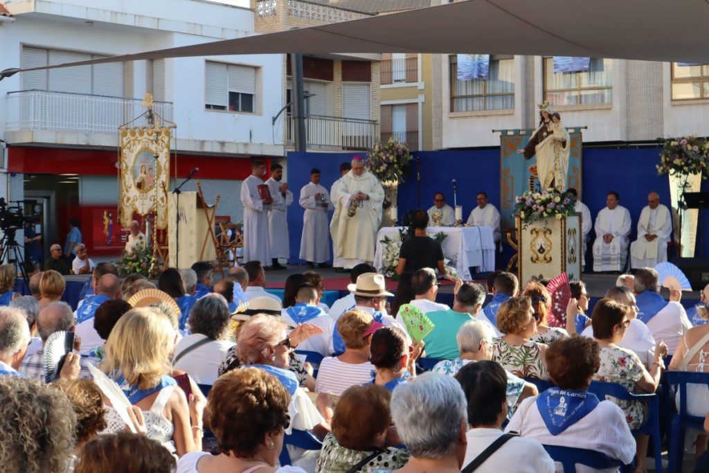 La jornada comenzó temprano, con una diana musical que recorrió las calles de la localidad y la celebración de una misa de campaña en la plaza de la Constitución. El obispo de la diócesis de Cartagena, José Manuel Lorca Planes, destacó la devoción por la Virgen del Carmen entre los hombres del mar y felicitó a todos los presentes.