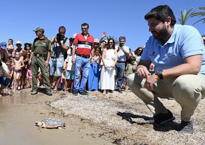 El presidente del Gobierno de la Región de Murcia, Fernando López Miras, participó en la suelta de 30 ejemplares de tortuga boba en la playa de Isla Playa, en Cartagena. Este acto forma parte de un proyecto de conservación de esta especie en peligro de extinción, en el que se han liberado un total de 133 ejemplares en los últimos diez años.