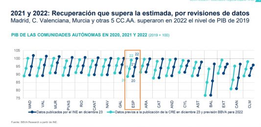 Murcia crecerá un 2,1% en 2023, según las previsiones de BBVA Research. Este incremento es inferior al de la media nacional (2,4%), pero superior al de otras comunidades autónomas como Andalucía (2%), Galicia (2%) o Castilla-La Mancha (2%). Para 2024, BBVA Research prevé que el PIB de Murcia crezca un 1,6%, un incremento superior al … Sigue leyendo Murcia crece un 2,1% en 2023 y un 1,6% en 2024, según BBVA Research