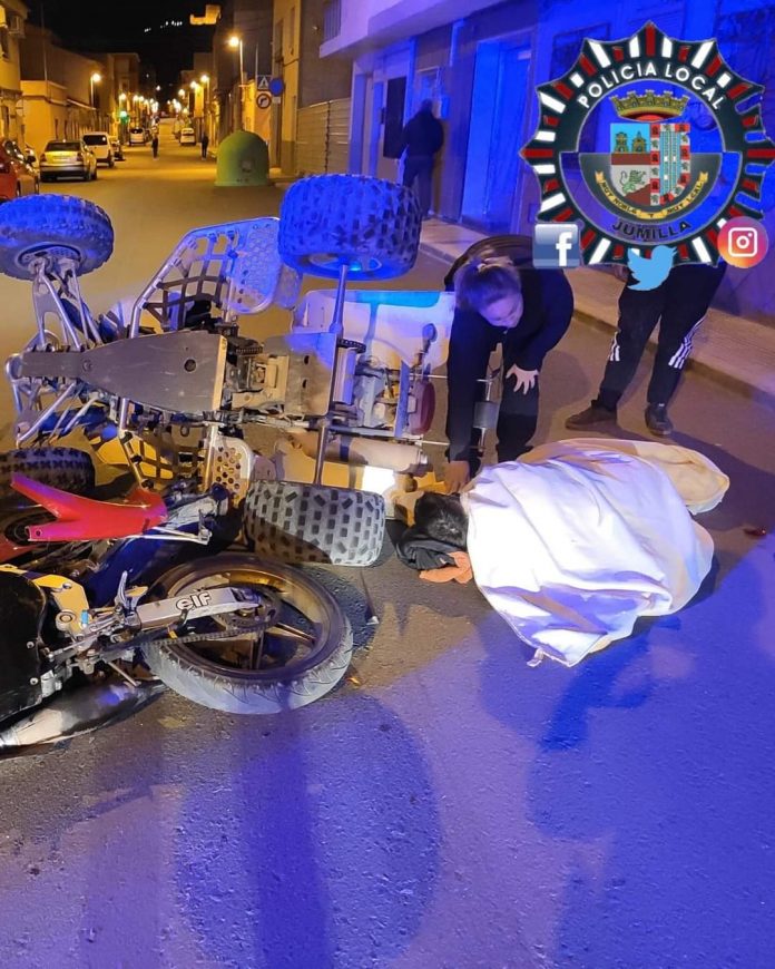 En la confluencia de las calles Ortega y Gasset con Beato Imbernon en Jumilla, se ha producido un aparatoso accidente de tráfico entre una moto y un quad. Los servicios de emergencia han intervenido rápidamente tras recibir varias llamadas alertando sobre el suceso.